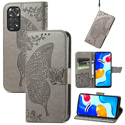 WEIOU Leather Folio Cover per Xiaomi Redmi Note 11S | Note 11 4G, Goffratura a Farfalla Custodia in Pelle PU Magnetica Libro Flip Portafoglio Case con [Funzione Stand]. Grigio