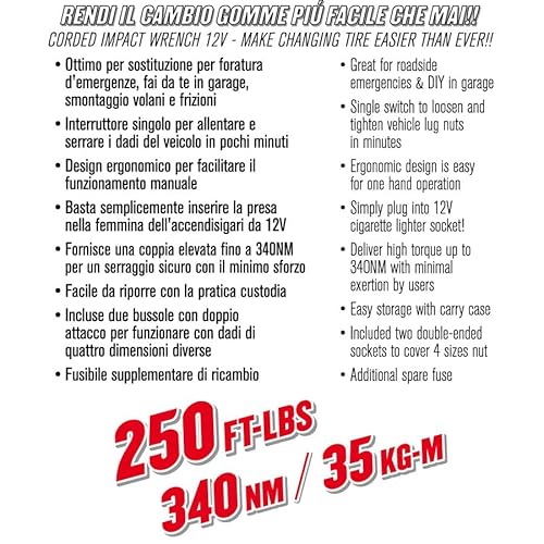Incluse due bussole con doppio attacco per funzionare con dadi di 4 misure diverse. Corrente massima: 13amp. Fusibile in linea: 15amp.