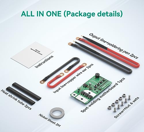 Accessori completi: il pacchetto include 1 scheda madre per saldatura a punti, 2 linee di ingresso, 2 orecchie in filo di rame, 2 m di nichel, 6 set di viti + dado, 2 linee di uscita. 2 penne per saldatura, 2 tubi termoretraibili. Installa la batteria ad alta velocità. pronto per saldare la tua batteria.