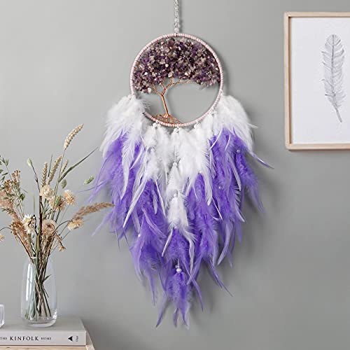 Weldomcor acchiappasogni da Appendere alla Parete Boho Decor acchiappasogni Cristallo Fatto Mano Albero della Vita con Piuma Tradizionale Bohémien Decorazione per la casa Artigianale (Viola)