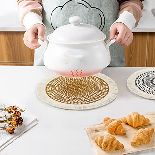 【Perfetta protezione da tavolo】: le nostre tovagliette rotonde e affascinanti con nappe sono resistenti al calore, antiscivolo, resistenti all'usura, lavabili, prevengono efficacemente perdite e macchie, proteggono il tavolo e la tovaglia da graffi o altri danni.
