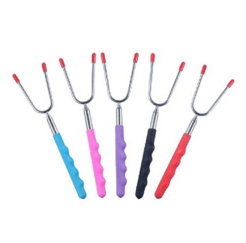 Welecom - Spiedi da barbecue a forma di forchetta, allungabili con sistema a telescopio, extra lunghi (86,1 cm), ideali per arrostire marshmallow e hot dog, da campeggio, confezione da 5 spiedi di colori diversi