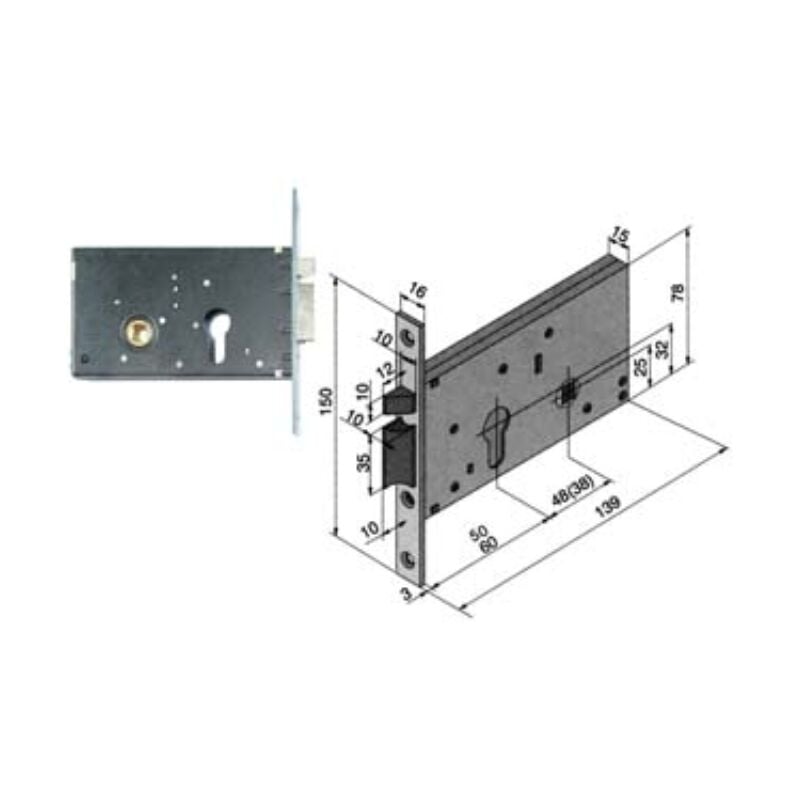 Mm.50 (30250010) scatola e frontale in acciaio zincato, frontale da mm.16, scrocchi reversibili in ottone, con quadro maniglia da mm.8 passante, funzionante con cilindro sagomato tipo europeo non compreso, tensione 12v, scatola mm.78h. Categoria merceologica: Elettroserrature e accessori - Sicurezza - Serrature elettriche per fasce da infilare