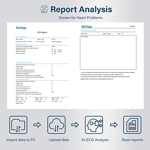 ANALISI AI PROFESSIONALE: supporta l'analisi AI GRATUITA e può esaminare più di 104 eventi cardiaci anormali in 16 categorie. La tecnologia AI si basa su 300.000 utenti e 50 milioni di frammenti di dati accuratamente etichettati. ★Basta scaricare il software per PC/app per Mac e collegare il dispositivo al computer per visualizzare la forma d'onda ECG/EKG e ottenere il rapporto di analisi AI-ECG.