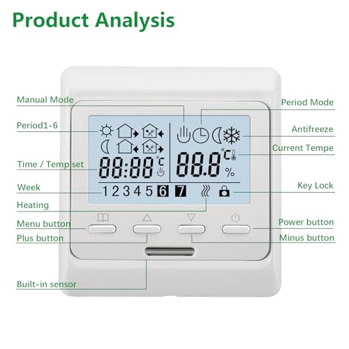 Il termostato per riscaldamento a pavimento ha un sensore integrato con una precisione di misurazione di 0,1°C, installazione incassata e certificazione CE. Impostare la temperatura premendo il pulsante, la corrente di uscita è 3A, facile da installare e utilizzare.