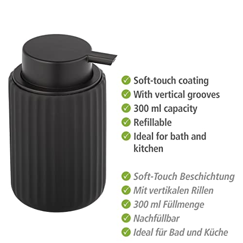 Design moderno: solo il meglio per la vostra casa: il dispenser di sapone Belluno alla moda con struttura scanalata e superficie soft touch in nero opaco aggiunge un tocco stravagante al vostro bagno e WC degli ospiti