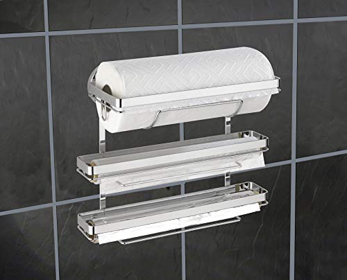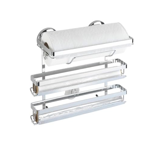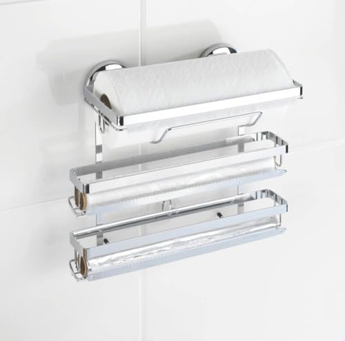WENKO Magic-Loc portarotolo da cucina Trio - per 3 diversi rotoli, fissaggio senza trapano, Metallo cromato, 33 x 32 x 16 cm, Argento lucido