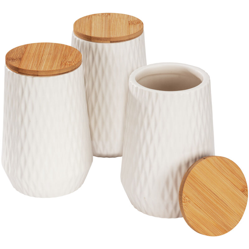 Il design armonioso e moderno nella tua cucina è garantito dagli eleganti vasi di conservazione bianchi Diamond di WENKO. Il set da 3 porta novità negli scaffali, sul piano di lavoro o nell'armadio dispensa. Le scatole di stoccaggio attirano l'attenzione per il loro design sobrio ma particolare. Il contenitore in ceramica di alta qualità di colore bianco offre un motivo a losanga strutturato che ricorda la forma dei diamanti e aggiunge un tocco discreto di eleganza alla scatola. Un dettaglio naturale aggiunge il tocco finale per rendere la scatola di conservazione un accessorio da cucina moderno: il coperchio è realizzato in legno di bambù certificato FSC® e costituisce quindi un vantaggio duraturo nel set di stoccaggio. Inoltre, il coperchio in bambù è dotato di una guarnizione in silicone a lunga durata che consente una chiusura ermetica della scatola. Le eleganti scatole ti permettono ad esempio di conservare zucchero, sale, caffè, tè o muesli senza dover accumulare confezioni