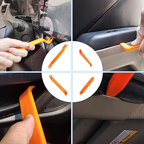 【kit rivetti in plastica auto】1 dispositivo di rimozione degli elementi di fissaggio e 4 strumenti di leva per la rimozione del pannello di rivestimento interno in plastica sono inclusi per facilità d'uso, che possono aiutarti a rimuovere facilmente ed efficacemente il pannello della portiera e il clip della tappezzeria senza danneggiare la carrozzeria. Anche le aree strette possono essere facilmente manipolate.