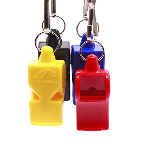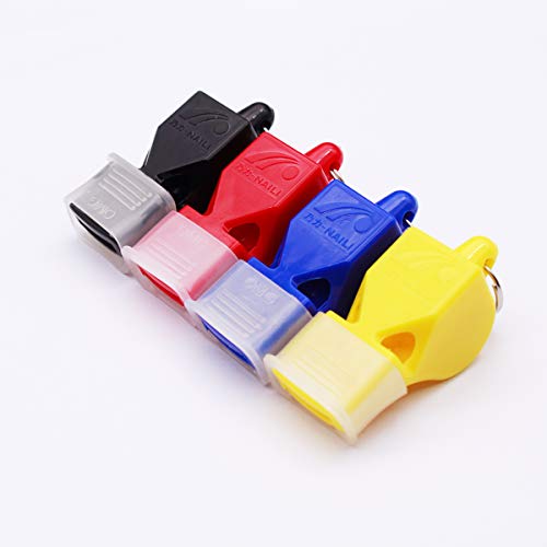 【Materiale】 Fischio del bagnino realizzato in materiale plastico ecologico, 4 fischietti di colore diverso sono inclusi in questo set di fischietti e i loro colori sono nero, blu, giallo e rosso