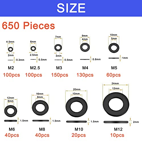 WeqeYent 650 pezzi Nero Rondelle Piatte, 9 dimensioni (M2 M2.5 M3 M4 M5 M6 M8 M10 M12) Assortimento della Rondella di Bloccaggio, Kit di Rondelle per Viti (Nero)