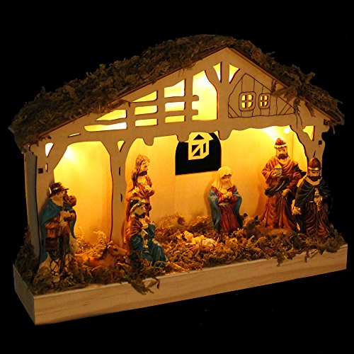 WeRChristmas, Presepe decorativo in legno, illuminato con 5 lucine LED (luce bianca calda), 26,3 x 7,3 x 19,2 cm