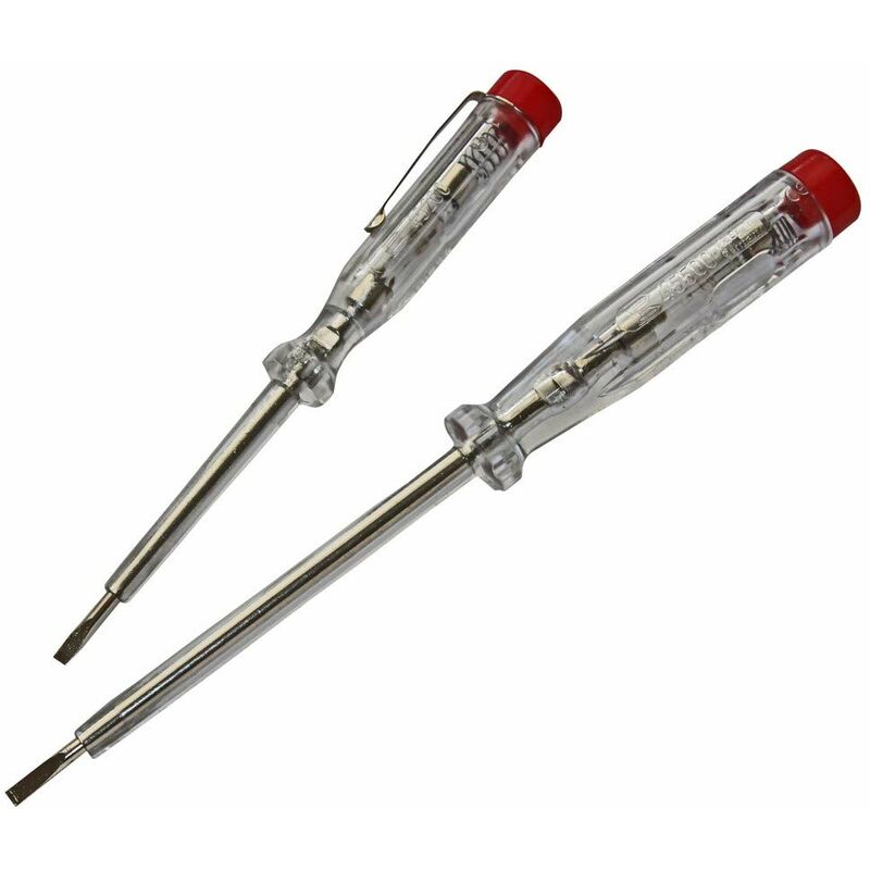 Set di 2 tester di tensione composto da 1 x 45200VDE (140 mm) e 1 x 45500VDE (190 mm). - Prodotto in Germania. - Qualità testata. - Tester di tensione (tester di fase) secondo VDE0680, certificato VDE/GS, con lampada a incandescenza integrata e lama per cacciavite in acciaio per utensili C60, temprato e zincato. - Intervallo di tensione: 120 - 250 Volt AC - Consente di rilevare tensioni alternative a bassa tensione fino a 250 V contro il potenziale di terra.