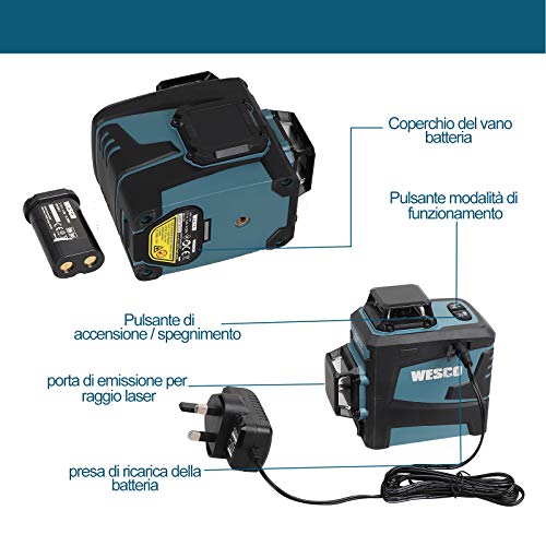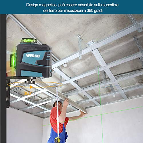 WESCO Livella Laser Verde 20m, 2 X 360° Linea Laser Auto-Livellamento a Croce ± 3° con Base Magnetico, con Li-ion Batteria da 3.7V 4400mAh Ricaricabile, Bordo Bersaglio Laser e Occhiali WS8913K