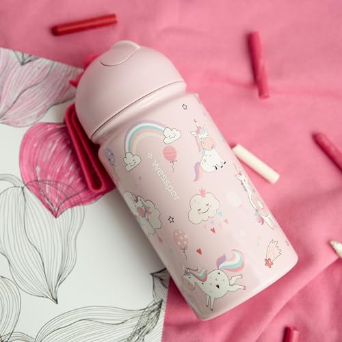 Wessper Borraccia Bambini 410 ml, Bottiglia Acqua con Cannuccia, Acciaio Inox a Prova di Perdite | senza BPA, Chiusura con 1 Clic, per l'asilo o la Scuola, Sport - Rosa con Motivo di Unicorno