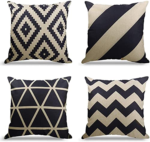 WEYON Confezione di 4 copricuscini Decorativi in Cotone e Lino, Blu scuro 50 x 50 cm, (geometrict Pattern)... (Black-beige, 50X50cm)