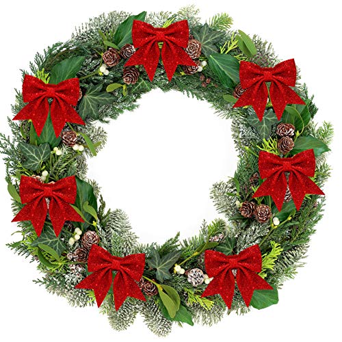 Decorazione natalizia glitterata - Il fiocco di Natale è con una tipica superficie rossa glitterata, perfetta per l'albero di Natale, l'albero di Natale e la decorazione interna o esterna. Si può indossare anche come accessorio per costumi. Nota: le paillettes cadono leggermente e traboccano leggermente la colla, ma ciò non influirà sull'estetica.