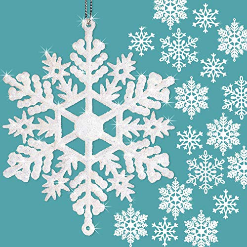 Whaline 40 Pezzi Decorazioni Pendenti Invernali Fiocchi di Neve Glitter Bianchi Ornamenti Pendenti con 197 Pollici di Corda d'Argento, Decorazioni a Tema Invernale Accessori per Porte Finestre
