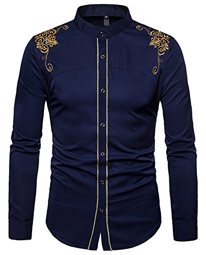 WHATLEES Camicia Casual Elegante Uomo - con Design Ricamato a Maniche Lunghe Blu
