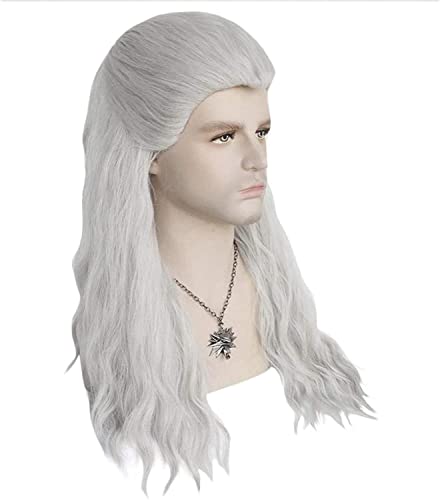 WHBHD 2022 Gioco Witcher Silver Grigio Grigio Lungo Dritto Parrucca Cosplay Parrucca Sintetica Anime Play Gioca Parrucche for Capelli for Party Halloween con Collana