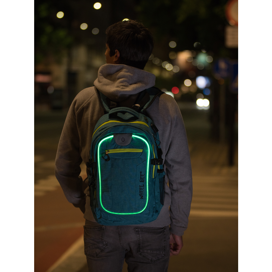 Dettagli del prodotto: Peso massimo del carico: 20 kg Con schienale fisso e imbottito, cinghie regolabili imbottite e base rinforzata Dotato della nota luce a LED (di colore verde - la luce verde è visibile soprattutto da lontano) e di strisce riflettenti aggiuntive, offre la massima visibilità e sicurezza al crepuscolo e al buio Interruttore di accensione/spegnimento della luce LED con 3 impostazioni (acceso continuo, lampeggiante lentamente, lampeggiante velocemente) Robusto materiale in poliestere 600D a 2 colori, doppiamente gommato per garantire durata e protezione dall'umidità Sistema di circolazione dell'aria sul retro aden Dotato di porta USB per la ricarica del telefono cellulare (cavo di collegamento incluso) e di uscita per le cuffie, Con 2 scomparti principali, 1 scomparto più piccolo, 2 scomparti antifurto nascosti, scomparto per computer portatile, 2 scomparti per Power banche e organizzatore di piccole parti Con maniglia per il trasporto, fascia toracica regolabile in altezza con fischietto d'emergenza e cintura per i fianchi Tasche esterne laterali in rete e cinghie laterali per il fissaggio di un ponticello, ecc. Richiede 2 batterie CR032 Durata della luce 100 ore Dimensioni e peso: Dimensioni da montato (lunghezza x larghezza x altezza): 46 x 32 x 20 cm Dimensioni dello scomparto per computer portatile (lunghezza x larghezza x altezza): 40 x 28 x 3,5 cm Volume: 30 litri Materiale e cura: Materiale: Poliestere 600D Incluso nella consegna: 1 x Wheel Bee ® Zaino R evolution, turchese 2 batterie CR032