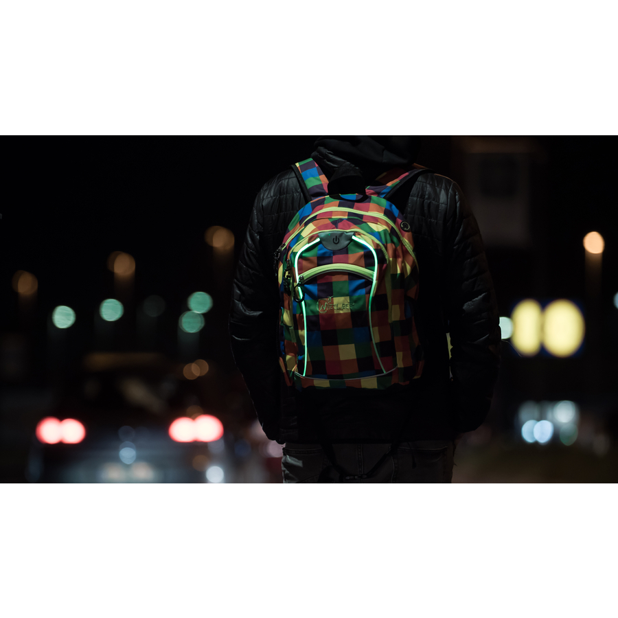 Dettagli del prodotto: I nuovi zaini Wheel-Bee® Night Vision combinano il fresco Design con la sicurezza Il sistema di illuminazione a LED integrato e ulteriormente sviluppato garantisce una maggiore tenuta delle fibre di vetro, assicura una maggiore trasmissione della luce e offre quindi ancora più visibilità e sicurezza al crepuscolo e al buio. Sono disponibili anche strisce riflettenti L'interruttore di accensione/spegnimento della luce LED ha 3 opzioni di impostazione (accensione continua, lampeggio lento, lampeggio veloce) Una fascia elastica aggiuntiva nella tasca della batteria garantisce una posizione adeguata per l'interruttore di accensione/spegnimento. I vari scomparti interni sono realizzati in un nuovo poliestere 410D a doppio rinforzo con rivestimento aggiuntivo in PU e offrono spazio sufficiente. Un tessuto robusto e gommato all'interno rende lo zaino idrorepellente e resistente Le tasche laterali in rete sono state ottimizzate e non possono più strapparsi Schienale e sistema di trasporto a doppia imbottitura, cintura anca regolabile in larghezza con nuova fibbia rinforzata, fascia toracica regolabile in larghezza con fischietto di segnalazione completano Night Vision s Richiede 2 batterie CR032 Durata della luce 100 ore Night Vision Backpack s sono il compagno ideale in bicicletta o a piedi, per andare in ufficio, a scuola, all'università, per fare sport. Dimensioni e peso: Dimensioni da assemblato (lunghezza x larghezza x altezza): 46 x 31 x 20 cm Volume: 30 litri Materiale e cura: Materiale: poliestere 600D Incluso nella consegna: 1 x Wheel Bee ® Zaino Night Vision, orange /blu/verde 2 batterie CR032