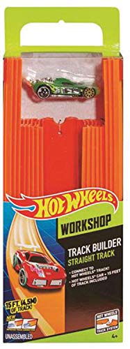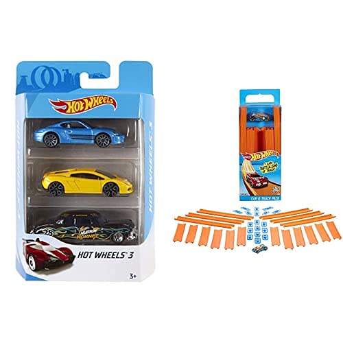 Hot Wheels 3 Macchinine Assortite + Track Builder BHT77, Confezione da 15 Rettilinei + 1 Veicolo