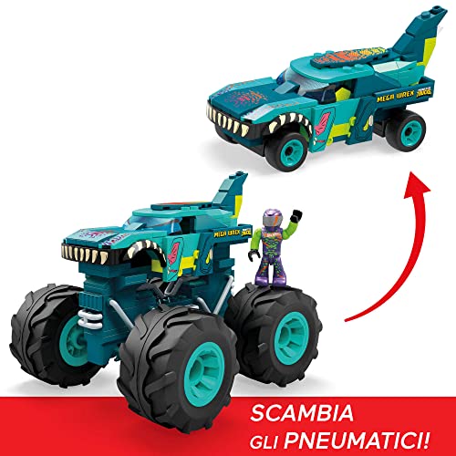 Giocattolo per la costruzione del Monster Truck Mega Wrex Hot Wheels MEGA composto da 187 pezzi e un treno di gomme extra per trasformare il veicolo in un'auto da corsa