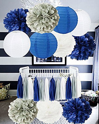 Navy Grey White Bridal Shower Decorations Furuix Tissue Pom Poms Lanterne di carta Blu navy Bianco Grey Ghirlanda di nastri per decorazioni per feste di compleanno Decorazioni di nozze / Decorazioni per Baby Shower