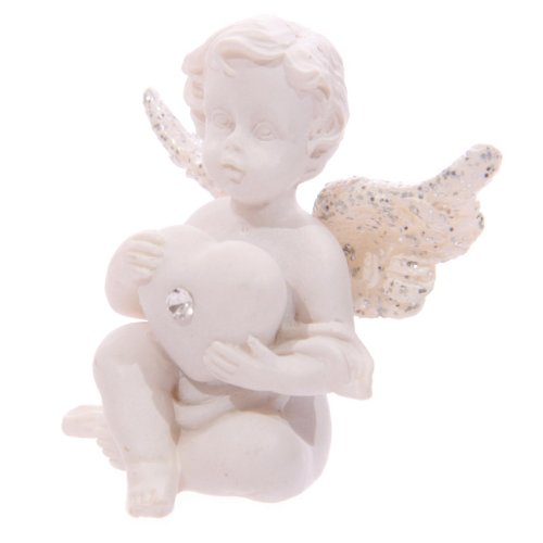 White Sitting Cherub Holding Heart with Silver Gem