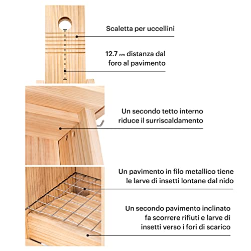 BEN COSTRUITO - Realizzato con legno di cedro spesso 1,9 cm. Un anello in acciaio inossidabile protegge il foro d'ingresso e una spessa protezione in legno contrasta i predatori. Le viti vengono utilizzate al posto dei chiodi per una costruzione più duratura.
