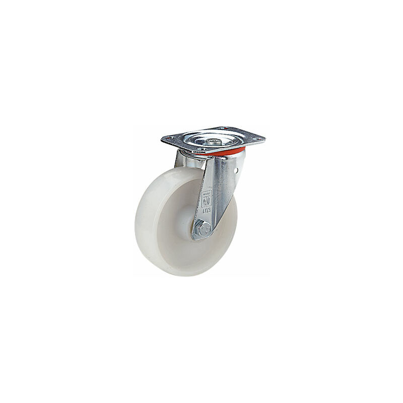 Ruota in poliammide, supporto in lamiera di acciaio, Ø x larghezza ruota 150 x 40 mm, rotella pivottante, cuscinetti a strisciamento. Fornitura = montato. Diametro ruote = 150 mm. Forma = rotella pivottante. Materiale ruote = plastica - poliammide. Materiale cerchioni = poliammide. Materiale corpo = acciaio. Portata a 4 km/h = 300 kg. Tipo di fissaggio = con piastra di fissaggio. Larghezza ruote = 40 mm. Altezza d'ingombro = 185 mm. Cuscinetti ruota = cuscinetto a strisciamento. Resistenza alle temperature = da -20 °C fino a +80 °C. Sporgenza rotelle pivottanti = 52 mm. Diametro fori filettati = 11 mm. Lunghezza mozzo = 60 mm. Foro mozzo = 20 mm. Dimensioni piastra rotella a supporto fisso mm = 135x114 mm. Dimensioni piastra rotella pivottante = 135x110 mm. Interasse fori filettati = 105x75 - 80 mm. Superficie del corpo = zinco-cromata. Non richiedono manutenzione, scorrimento agevole. Resistenti all'attrito. Non temono la maggior parte di acidi e basi diluiti. Resistenti a temperature