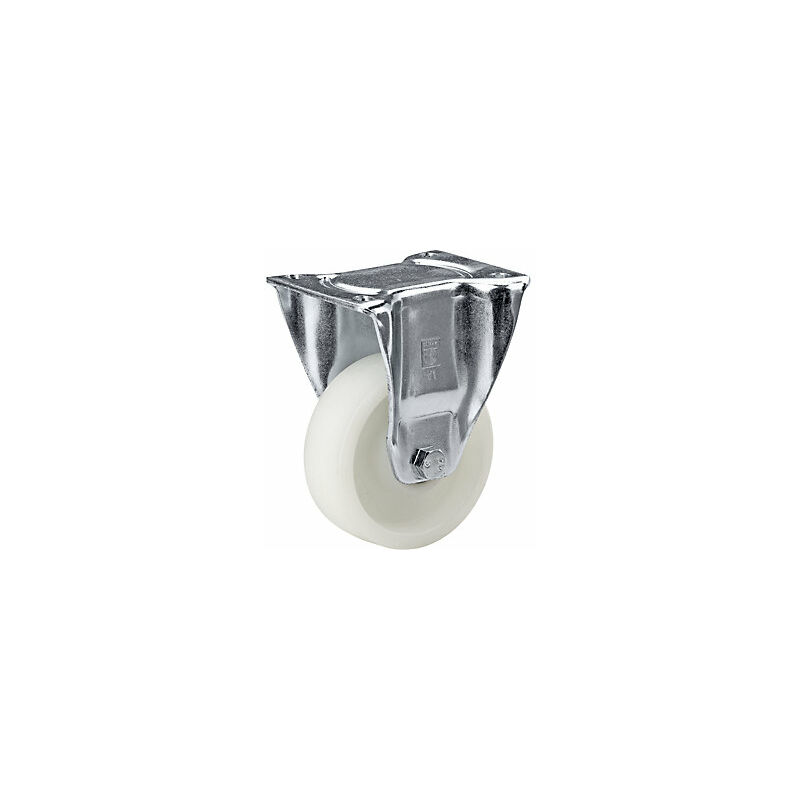 Ruota in poliammide, supporto in lamiera d'acciaio, Ø x larghezza ruota 80 x 30 mm, rotella a supporto fisso, cuscinetti a strisciamento. Fornitura = montato. Diametro ruote = 80 mm. Forma = rotella a supporto fisso. Materiale ruote = plastica - poliammide. Materiale cerchioni = poliammide. Materiale corpo = acciaio. Portata a 4 km/h = 250 kg. Tipo di fissaggio = con piastra di fissaggio. Larghezza ruote = 30 mm. Altezza d'ingombro = 118 mm. Cuscinetti ruota = cuscinetto a strisciamento. Resistenza alle temperature = da -20 °C fino a +80 °C. Diametro fori filettati = 9 mm. Lunghezza mozzo = 40 mm. Foro mozzo = 12 mm. Dimensioni piastra rotella a supporto fisso mm = 100x87 mm. Dimensioni piastra rotella pivottante = 105x85 mm. Interasse fori filettati = 80x60 mm. Superficie del corpo = zinco-cromata. Elevata resistenza all'attrito. Supporto rinforzato. Portata elevata. Resistenti a temperature da -20 °C a +80 °C. Cuscinetti di pivottaggio con doppia corona a sfere temprata e protezione.