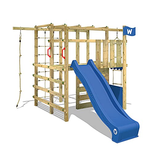 WICKEY Parco giochi in legno Smart Champ Giochi da giardino con scivolo blu, Scala svedese, Barre di scimmia, Struttura da gioco con parete d'arrampicata per bambini
