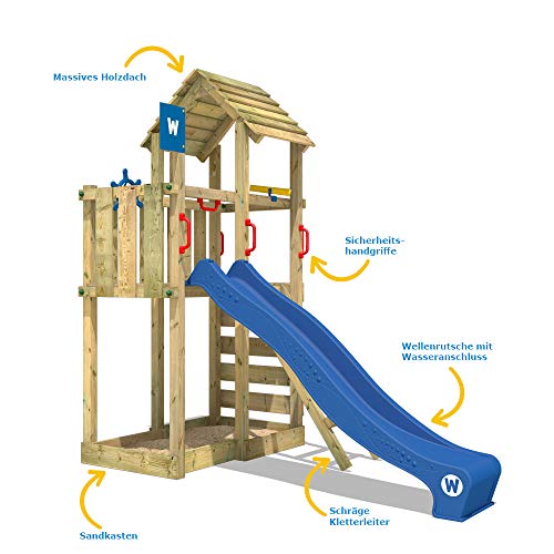 WICKEY Parco giochi in legno Smart Flash Giochi da giardino con scivolo blu, Torre d'arrampicata da esterno con sabbiera e scala di risalita per bambini