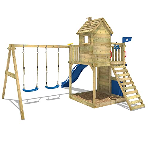 WICKEY Parco giochi in legno Smart Lodge 150 Giochi da giardino con altalena e scivolo blu, Casetta arrampicata da gioco con sabbiera per bambini