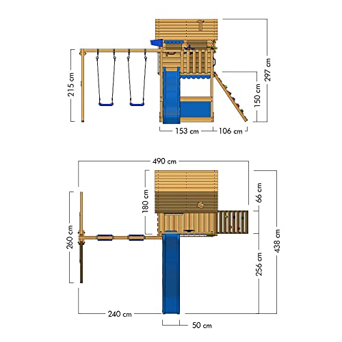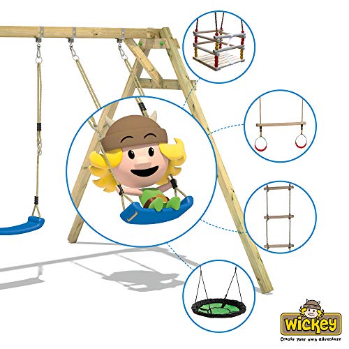 WICKEY Parco giochi in legno Smart Seaside Giochi da giardino con altalena e scivolo blu, Casa su palafitte da esterno con sabbiera e scala di risalita per bambini