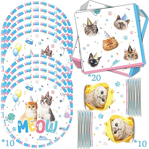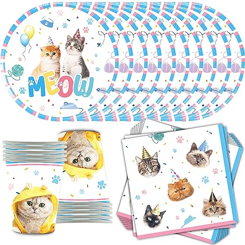 WIDEBG Gatto Stoviglie Compleanno Decorazioni Gatti Stoviglie per Feste Cat Bicchieri Piatti Carta Tovaglioli Gatto Stoviglie Set Bambini Forniture per Feste 10 Ospiti A