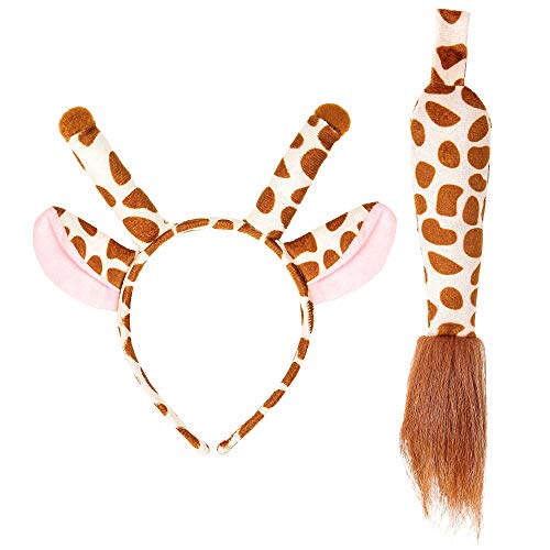 Il set è composto da un cerchietto con orecchie di giraffa e una coda. marrone e beige sono i colori in cui sono trattati i componenti