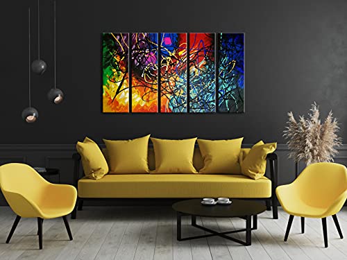 Set di 5 pannelli con linee astratte colorate su tela, dipinti ad olio, pronti da appendere per decorare la casa, ogni pannello ha un gancio nero già montato sulla barra di legno per appenderlo facilmente.