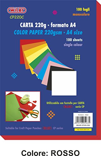 Wiler CP220C08 Confezione da 100 Fogli di Carta Colorata 220gsm Formato A4 Colore ROSSO