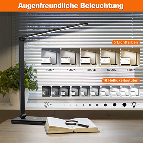 Wilktop Lampada da scrivania a LED, lampada da tavolo dimmerabile Ricarica wireless 10W e porta di ricarica USB, 10 livelli di luminosità, funzionamento con pannello touch a 5 colori(Nero)