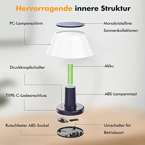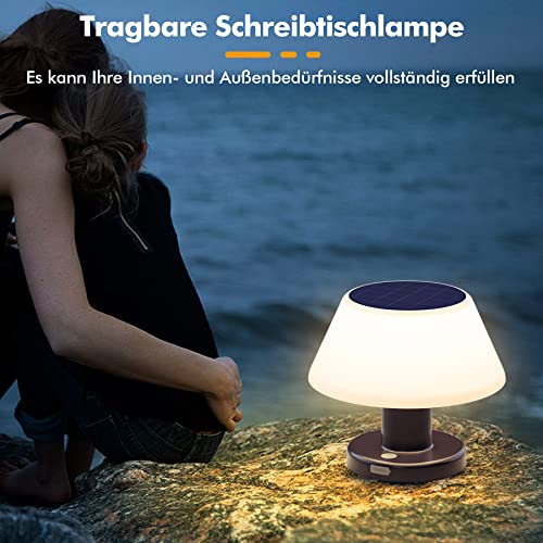 Lampada da tavolo USB C e solare: lampada da tavolo all'aperto con una potente batteria incorporata che può essere caricata in modalità di ricarica TYPE-C in solo 1 o 2 ore e in modalità solare in 4 o 5 ore, e un tempo di esecuzione di 1,5 a 9 ore, si può godere il vostro tempo comodamente.