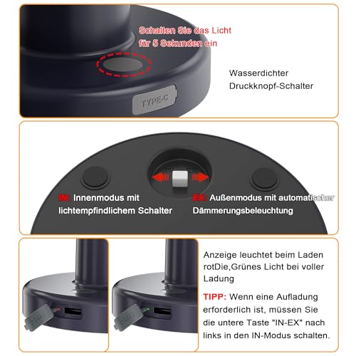 Lampada da tavolo solare 2 in 1: lampada da tavolo solare all'aperto può essere utilizzato sia all'esterno che all'interno, può essere collocato all'aperto per la ricarica solare quando è soleggiato, e può essere utilizzato per la ricarica di tipo c quando viene utilizzato all'interno, nota : la ricarica interna deve essere regolata per la modalità interna ,basta girare a sinistra nella parte inferiore della luce per "IN" pulsante