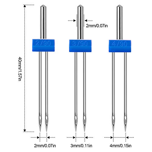 Quantità abbondante: ogni confezione include 18 pezzi di spilli gemelli con scatola di plastica e 1 pezzo di infila ago automatico, gli aghi gemelli sono in 3 diverse dimensioni, 2.0/ 90, 3.0/ 90 e 4.0/ 90, 6 pezzi per ogni taglia