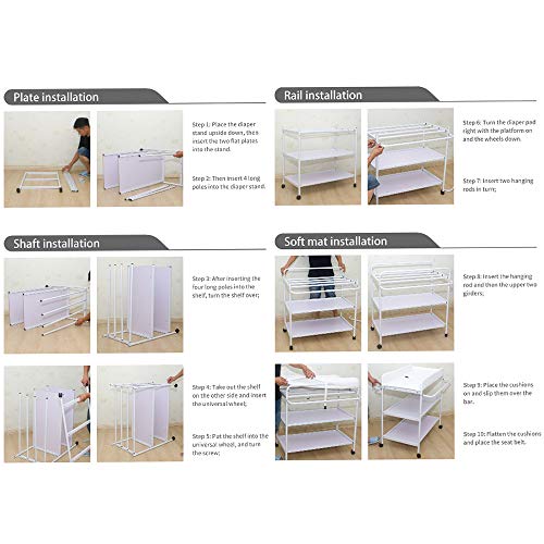 Design universale con ruota: il tavolo multifunzionale di cura dei pannolini per bambini ha una forte capacità di carico e le madri possono essere tranquille. Il tubo in acciaio spesso può sopportare un carico totale fino a 130 kg. La ruota universale è progettata per un facile spostamento. L'insieme del tavolo a strati può anche essere fissato sotto, potete scegliere liberamente mobile o fisso