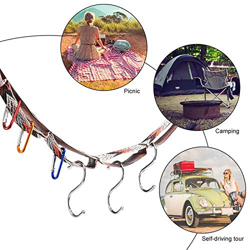 Regolabile Cinghia di Sospensione: Il corda di stoccaggio ha 11 intervalli semicircolari, facile da organizzare articoli da campeggio, e non scivolerà liberamente per prevenire le collisioni. I ganci appiccicosi può essere usato per appendere sciarpe e abiti di seta. Viene con custodia facile da riporre quando non in uso, non occupa troppo spazio