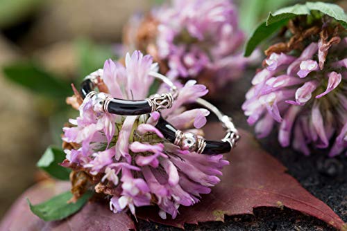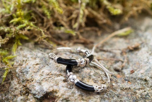 Delicati orecchini a cerchio in stile vichingo in argento anticato, decorati con ornamenti e perle nere lunghe