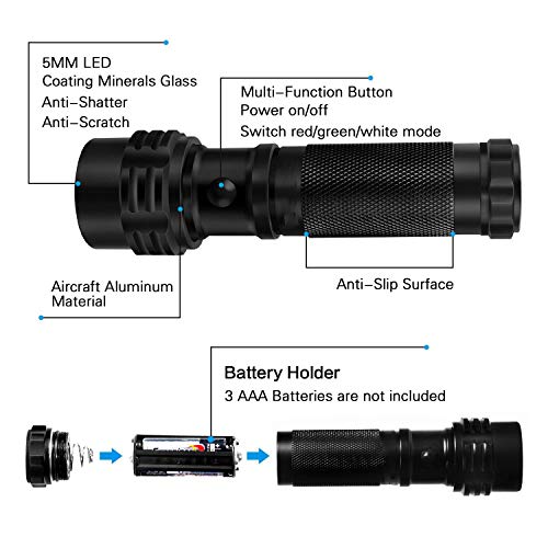 Résistant à l'eau - La lampe de poche à lumière rouge / verte / blanche est résistante à l'eau IPX-7, ce qui en fait le plus haut niveau de résistance à l'eau. Fonctionne, sous l'eau ou dans un endroit humide. Ne vous inquiétez pas le jour de pluie. Remarque: N