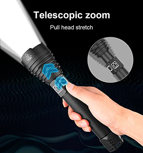 WindFire Torcia a LED XHP90 Torcia USB ricaricabile da 100000 lumen, torcia impermeabile zoomabile con batteria da 2 pezzi 5000 mAh e proiettore a 3 modalità per emergenza all'aperto